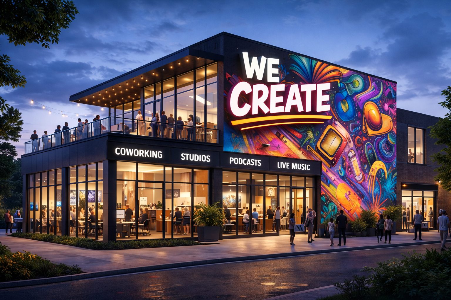 • Studio spaces for music, podcasting, and content creation.